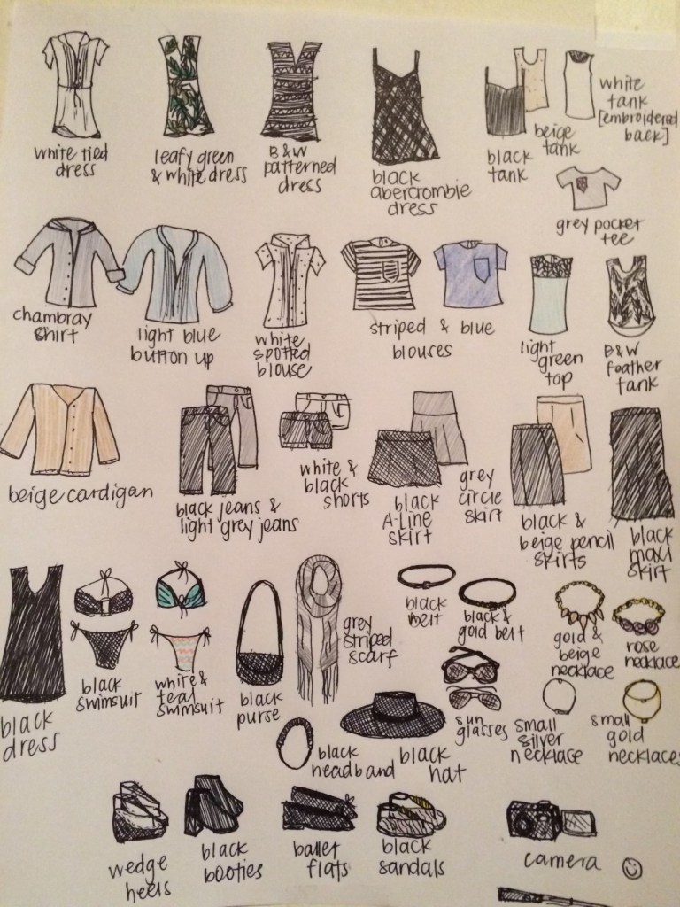 Initially when I first started experimenting with the capsule wardrobe, I wanted a visual of everything together so I drew each piece of clothing individually so I could see the items next to each other, and my imagination could take it from here.