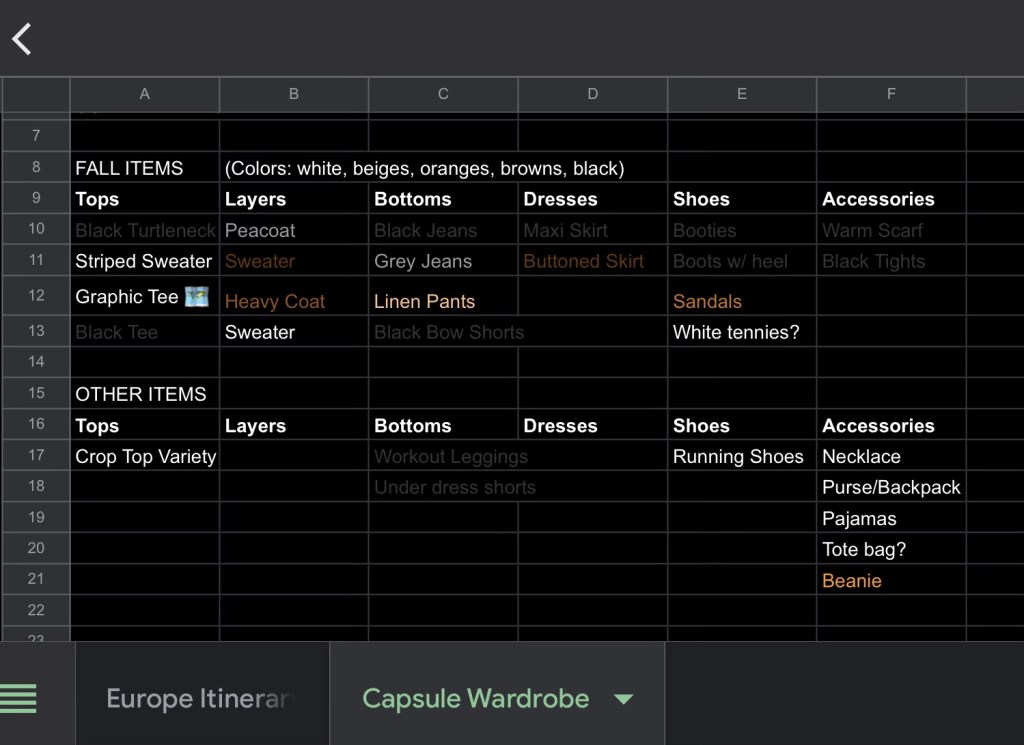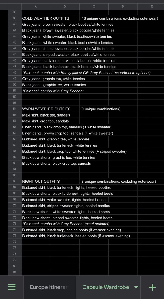 If you remember anything about probability and combinations from math class, the following technique might be triggering BUT it can also help you organize all your ideas in a way that is easier than taking a photo of yourself in each outfit or photoshopping your outfits one at a time. Now I’ll typically make a list that looks something like this: