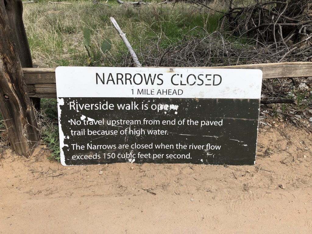 This is an out-and-back trail, but you can turn around whenever you want, and it goes back for probably ten miles or so. (I’ve never been to the end.) Always check the conditions at the Visitor Center before you go, as if there is rain in the forecast, this walk is not advised because flash floods are a real risk, and occasionally the water level is simply too high or the flow is moving too fast. This adventure is extremely popular in the summertime and will likely be very crowded unless you’re going very early or very late in the day. You are also limited to the shuttle times, so make sure you’re at the bus stop before the last bus departs back to the park entrance!