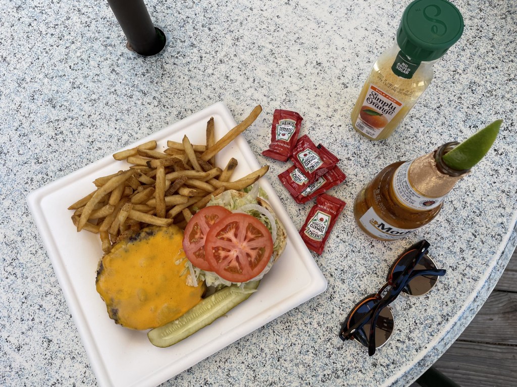 Bison burgers and seafood dishes are popular.