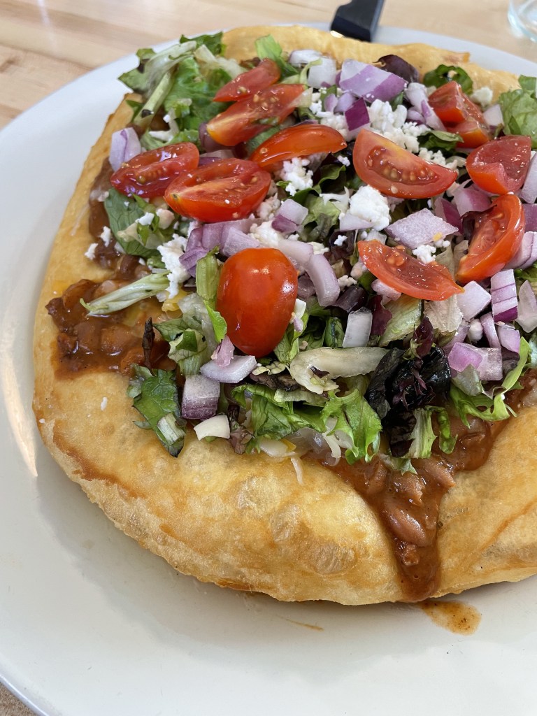 To my understanding, the story behind the fry bread is that during the 1800s, tribes were forced to relocate to New Mexico (called the “Long Walk”) by the US Government. They were provided with rations of flour and other basic ingredients during this time for survival by the US Government which the people used to create fry bread. While mouthwateringly delicious, fry bread is not healthy and has been thought to be a cause for an obesity epidemic in the area. Fry bread is recognized as a symbol of resilience and unity by the people, but also carries with it memories of pain and hardship.